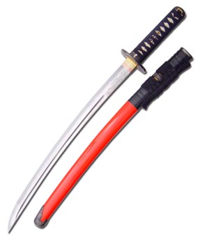 Each piece in the Kami group has a hand-forged and folded ASSAB-K120C powder steel blade, differentially tempered to produce an HRC60 edge, HRC40 back and a distinctive hamon. Saya are deeply lacquered in red, with a black ring-carved section at the sageo. The ray skin used on the tsuka is of the highest quality, and the tsuka-ito on the Katana and Wakizashi and the sageo on all three pieces are woven from best quality Japanese silk. The Fuchi, Kashira, Kojiri, Koiguchi and Kurigata are all made from blackened bronze, with decoration in relief and selective detailing of copper, silver and gold. The Tsuba of the Katana and Wakizashi, depicting the Kami, or Guardian Warriors, are made from hardened blackened copper, with decoration in relief and selective silver and gold detailing. The Habaki is of two-piece construction, the inner section being copper and the outer section gold-plated brass. The blades are engraved, at the Habaki, with a hand-engraved "Fudo" horomono, a traditional blade carving from the Edo period. The blades of all three pieces are grooved on both sides, and each piece features a long Kissaki. See Models SH1201 and SH1203 for the Katana and Tanto details.